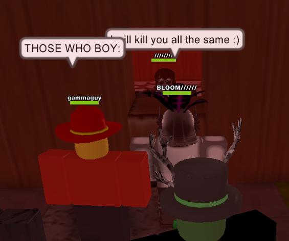 from here we kind of just waited for its next move, as i tried to warn everyone that we should check every boarded up window and exit incase a breach is being made or is being planned at the moment. thankfully, nothing really came of a "breach" until later on when another person in the group noticed //////// standing ominously in the boarded up window of the church looking at us. by the way i just want to add that i have zero idea how it got up there so fast it was honestly kind of impressive. anyways, since theres a possible murderer staring us in the eyes, our idea is to kill it as fast as possible, which we did. this seemed to have solved the situation as ///////// ended up leaving the server immediately after. HOWEVER. it turns out we weren't meant to do that as blossom told us that: