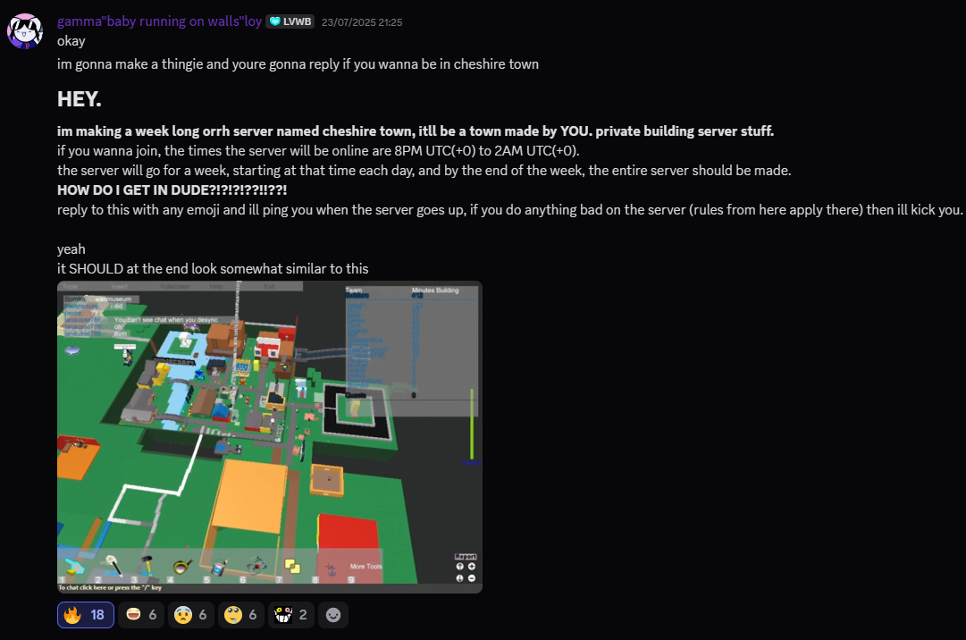 cheshire town was a roblox public building server (think minecraft) that i hosted in the cheshire-club discord server (formerly the IHasAFaceLulz server (which is a roblox arg)) from july 28th to august 3rd 2025. the server, in those seven days, was able to garner 20 players and fill the entire once desolate map with various buildings, attractions, the sorts. however, suddenly many strange things began to happen that i genuinley had no idea about. weird people, strange glitches, and a massive church being created. dear god its an arg.