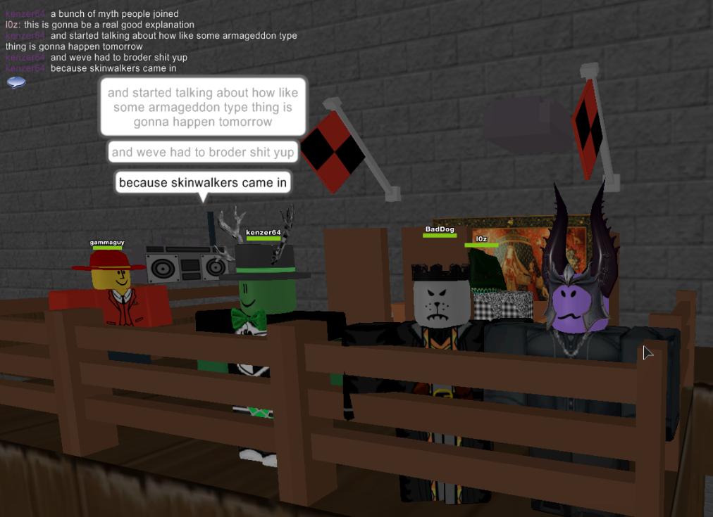 a lot of arguing occurs and many users actually fled to an island far away to try and hide (due to the apocalypse happening of course). blossom, gamma (me), ///////, kenzer and a few others then ended up at the olive garden building. during this, blossom turns to kenzer and begins to basically just explain everything ive explained here, they knew the skater, they died, this is yet another skinwalker, ect ect. kenzer then spawns a sword out of view and then pretends to leave the building, however, they come back in and strike the undeletable tony hawk game which ends up killing //////// persumably for good.