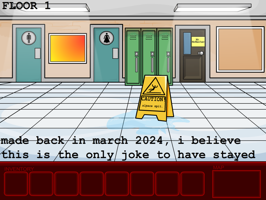 these are the first classrooms i were able to draw for the game. a lot of the jokes from these rooms actually made it into the final game, although they may have moved places. the only joke that stayed the exact same was the "alpaca spit wet floor sign" thing. i had that one in my head for a while since for some bizarre reason i thought it was really funny. i mean it was, but it sounds like a novelty item you'd get off some local shop.