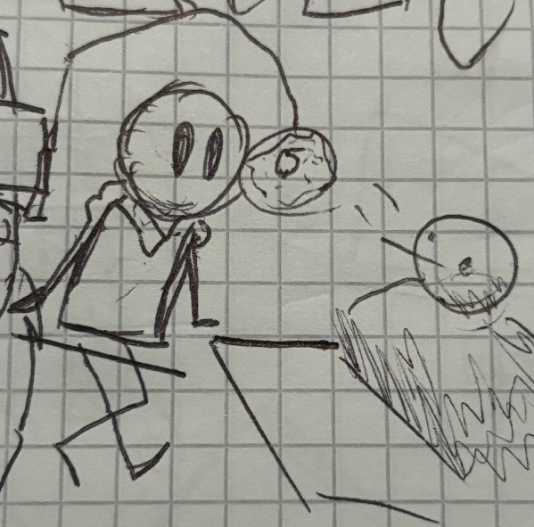 to optimise creating the game, i took upon the challenge of not doing maths work to instead draw phil eggtree hitting the griddy. i actually was able to note down and plan a lot of the game this way. there's more in my modern studies book it's just that i'm pretty sure that's been thrown away, which sucks.